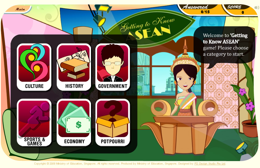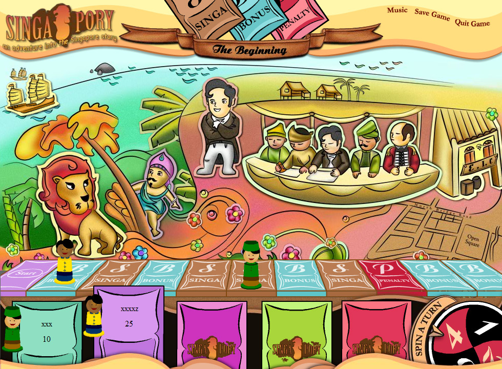 Singapory is an interactive boardgame for primary school children. They get to play through 5 important eras of Singapore's history. The game master has the ability to change the question list with a built-in editor.